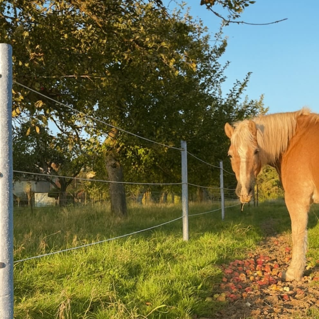 Ce choix n’est pas anodin : l’un des chevaux de Camille avait tendance à tester les clôtures. Les fils ont donc été positionnés de manière plus visible et plus dissuasive que sur des installations classiques.